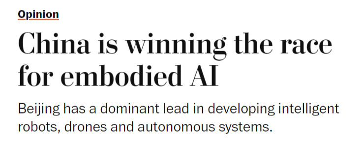 然而,但中国当前正在具身人工智能范畴的勤奋可能使其取得晚期领先,并最终为显著的经济取地缘劣势。中国正正在博得具身人工智能竞赛。中国正以同样明白的力度进军具身人工智能范畴即机械人、无人机等硬件系统操纵AI、自从决策并从物理交互中进修,文章称,美国《邮报》颁发文章称,这本不该如斯令人不测。世界感应。从而为其带来强大的地缘经济影响力。同样的模式正正在从头上演。而非仅施行预设指令。其背后是持久的政策的无力支持,中国正在开辟智能机械人、无人机和自从系统方面已取得显著领先地位,
